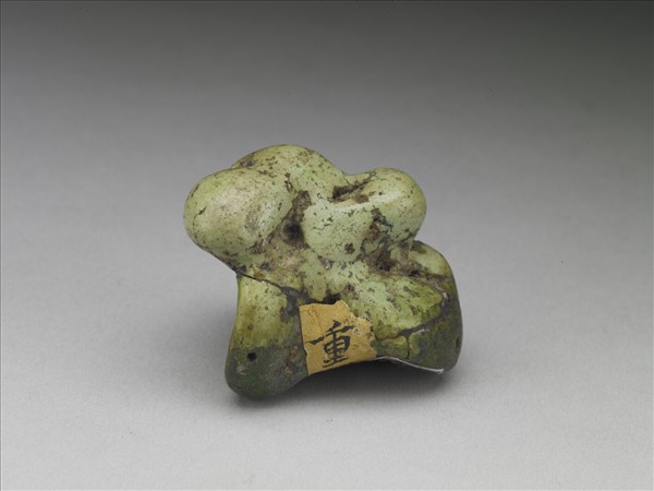 不規則形松石一塊,呈綠色,夾雜黑褐色斑塊及網絡狀紋理,有小孔。表面略經打磨,留待製作用品或飾物。可能由於受到曝曬或污染等因素,使得表面帶淺黃褐色。松石為綠松石或松綠石之簡稱,質地細膩、色澤溫潤,中國多地出產。