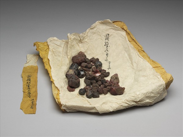 碎寶石一包,共計伍拾叁塊,大小不一,均為不規則形。寶石呈深紅色或藍色,可見內部天然結晶紋理;表面略經打磨,大多仍保留礦石原形,留待製作用品或飾物。