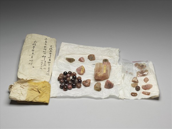 碧璽一塊。故雜5023至故雜5091以上陸拾玖塊裝成一包,整體數量甚多,大小不一,色澤呈粉紅色到紫色不等,可見內部天然結晶紋理。表面略經打磨,部分已雕琢成珠球或卵形,留待製作用品或飾物。