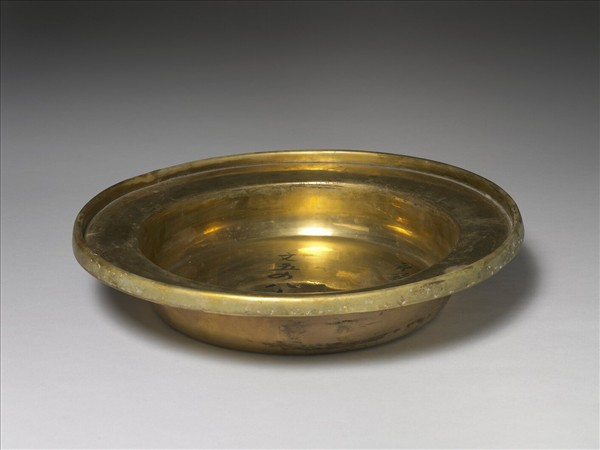 銅胎鍍金,盤口,豎邊,深壁漸收,平底。銅胎鍍金,全器光素無紋。盤沿內面鏨刻「同治元年造」、「八成色金重庫平七十五兩」楷字。