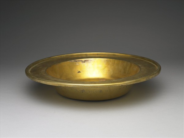 銅胎鍍金,盤口,豎邊,深壁漸收,平底。銅胎鍍金,全器光素無紋。器內底鏨刻「營造司造京平重八十八兩五錢」、「宣統癸丑年造」、「鍍金七兩八錢」楷字。