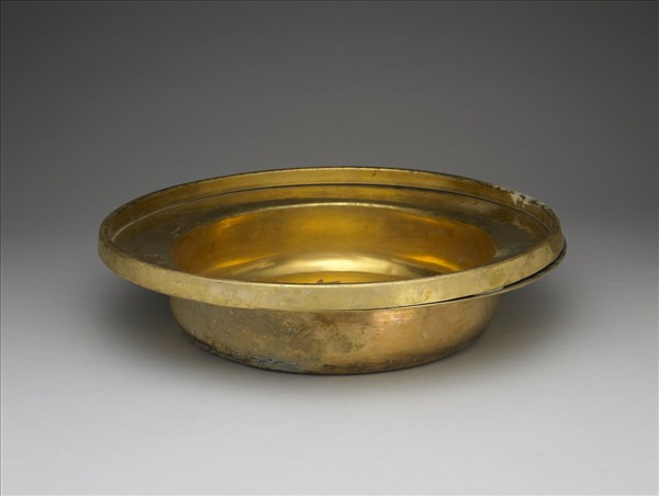 銅胎鍍金,盤口,豎邊,深壁漸收,平底。銅胎鍍金,全器光素無紋。但口緣部分已脫落損壞。