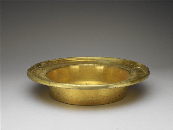 銅胎鍍金,盤口,豎邊,深壁漸收,平底。銅胎鍍金,全器光素無紋。
