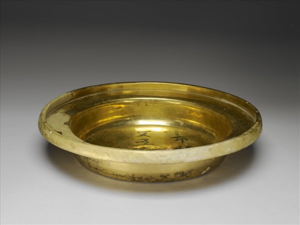 銅胎鍍金,盤口,豎邊,深壁漸收,平底。銅胎鍍金,全器光素無紋。
