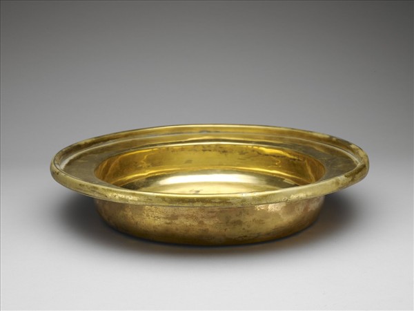 銅胎鍍金,盤口,豎邊,深壁漸收,平底。銅胎鍍金,全器光素無紋。盤沿內面鏨刻「同治四年」、「八成色金重庫平七十五兩」楷字。