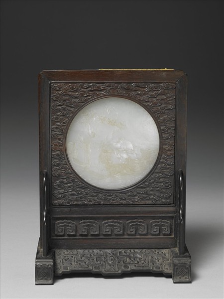 木方屏,整器作一四方屏嵌於木座上,木座以如意雲紋、幾何雲氣紋為飾,上並有填金楷字「乙」。方屏外壁面雕飾雲紋,中央圓形開光嵌白玉,兩面白玉雕飾不同,其一面上雕三腳金烏站立於雲氣之上,當是象徵太陽,只是金烏外貌如公雞,是根據其三腳的特徵才得以辨認其指陳;另面則雕樹下兔子一隻蹲伏,當是象徵月亮。則一日一月,恰互相對照。