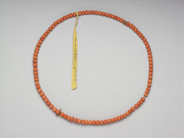 珊瑚圓珠,計有一百顆,色澤橘紅,顏色分佈自然均勻,珠表面平滑光亮,質純色美,渾圓飽滿。珊瑚珠大小均勻,以綿線串為一串。由上繫黃籤墨書「上字二十五號珊瑚珠一百個重五兩三錢」,可知此串珊瑚珠為清代宮廷內的服飾材料。撿選大小相等之珊瑚珠,以綿線串起,一百顆為一串,加以秤重,註明於黃籤上,如此數目重量清楚,便於整理收納。