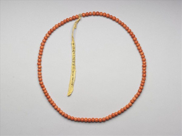珊瑚圓珠,計有一百顆,色澤橘紅,顏色分佈自然均勻,珠表面平滑光亮,質純色美,渾圓飽滿。珊瑚珠大小均勻,以綿線串為一串。由上繫黃籤墨書「中字九十六號珊瑚珠一百箇重三兩」,可知此串珊瑚珠為清代宮廷內的服飾材料。撿選大小相等之珊瑚珠,以綿線串起,一百顆為一串,加以秤重,註明於黃籤上,如此數目重量清楚,便於整理收納。