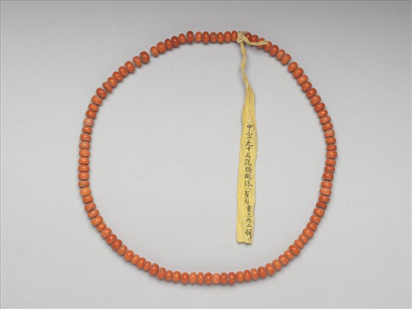 珊瑚圓珠,計有一百顆,色澤橘紅,顏色分佈自然均勻,珠表面平滑光亮,質純色美,渾圓飽滿。珊瑚珠大小均勻,以綿線串為一串。由上繫黃籤墨書「中字九十五號珊瑚珠一百箇重三兩二錢」,可知此串珊瑚珠為清代宮廷內的服飾材料。撿選大小相等之珊瑚珠,以綿線串起,一百顆為一串,加以秤重,註明於黃籤上,如此數目重量清楚,便於整理收納。