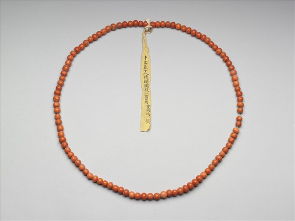 珊瑚圓珠,計有一百顆,色澤橘紅,顏色分佈自然均勻,珠表面平滑光亮。珊瑚珠大小均勻,以綿線串為一串。由上繫黃籤墨書「中字五十八號珊瑚珠一百箇重四兩一錢」,可知此串珊瑚珠為清代宮廷內的服飾材料。撿選大小相等之珊瑚珠,以綿線串起,一百顆為一串,加以秤重,註明於黃籤上,如此數目重量清楚,便於整理收納。