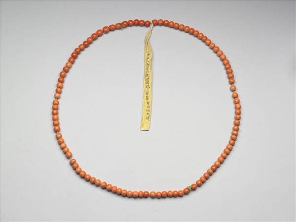 珊瑚圓珠,計有一百顆,色澤橘紅,顏色分佈自然均勻,珠表面平滑光亮。珊瑚珠大小均勻,以綿線串為一串。由上繫黃籤墨書「中字一百三十六號珊瑚珠一百箇重四兩九錢」,可知此串珊瑚珠為清代宮廷內的服飾材料。撿選大小相等之珊瑚珠,以綿線串起,一百顆為一串,加以秤重,註明於黃籤上,如此數目重量清楚,便於整理收納。