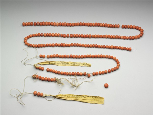 珊瑚圓珠二串,串繩散斷。圓珠共計有一百九十九顆,色澤橘紅,顏色分佈自然均勻,珠表面平滑光亮。由上繫黃籤墨書「上字十九號珊瑚珠一百箇重五兩一錢」、「中字四十五號珊瑚珠一百箇重三兩六錢」,可知此串珊瑚珠為清代宮廷內的服飾材料。撿選大小相等之珊瑚珠,以綿線串起,一百顆為一串,加以秤重,註明於黃籤上,如此數目重量清楚,便於整理收納。