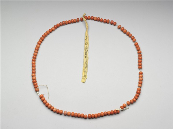 珊瑚圓珠一串,串繩已斷重繫。計有一百顆,色澤橘紅,顏色分佈自然均勻,珠表面平滑光亮。由上繫黃籤墨書「中字五十五號珊瑚珠一百箇重三兩二錢」,可知此串珊瑚珠為清代宮廷內的服飾材料。撿選大小相等之珊瑚珠,以綿線串起,一百顆為一串,加以秤重,註明於黃籤上,如此數目重量清楚,便於整理收納。