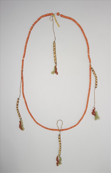 珊瑚數珠一串,計兩百十一顆。珊瑚珠色澤橘紅,珠表面平滑光亮,以綿線穿繫之。上繫記捻四組,記捻以紅絲線纏繞成管狀,並有白、黃、綠線編成格紋裝飾之,下綴紅、綠色絲穗。此數珠附黃籤一張,一面墨書:「珊瑚數珠一串計珠二百十一個」,一面墨書「道光五年六月八日收王住交」。數珠,佛教徒的祈禱用珠,一般以一○八珠為正軌,並分四段繫有佛頭、佛頭塔、記捻等,以方便記數。西藏進貢的數珠卻無定數,或可能是服飾的用物。