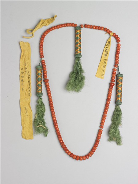 珊瑚數珠一串,計一百二十二顆。珊瑚珠色澤橘紅,珠表面平滑光亮,以綿線穿繫之。上繫記捻三組,記捻以綠絲線纏繞成管狀,並有黃、紅線編成格紋裝飾之,下綴綠色絲穗。此數珠上繫黃籤二張,一張一面墨書:「光緒二年潤五月初七日收陳進忠交」,一面墨書「珊瑚數珠一串計珠一百二十二箇」,另一張墨書「台吉郎結策忍恭請聖安呈進珊瑚數珠一串一百二十二个」。數珠,佛教徒的祈禱用珠,一般以一○八珠為正軌,並分四段繫有佛頭、佛頭塔、記捻等,以方便記數。西藏進貢的數珠卻無定數,或可能是服飾的用物。
