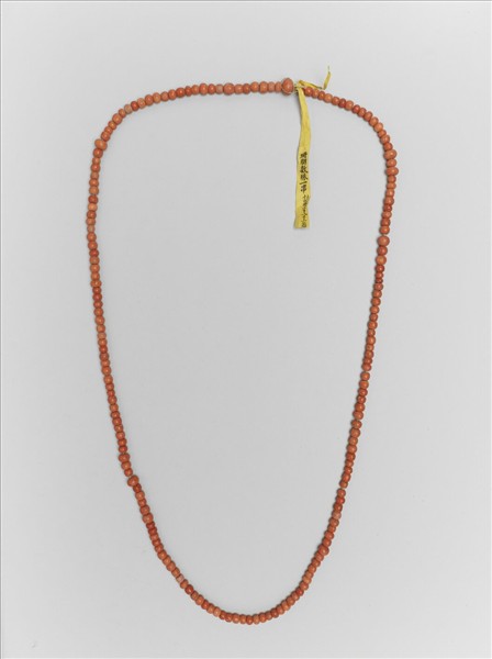 珊瑚數珠一串,計一百八十三顆。珊瑚珠色澤橘紅,顏色分佈自然均勻,珠表面平滑光亮,以綿線穿繫之。此數珠上繫黃籤一張,上有墨書:「珊瑚數珠一串/計珠一百八十三箇」。數珠,佛教徒的祈禱用珠,一般以一○八珠為正軌,並分四段繫有佛頭、佛頭塔、記捻等,以方便記數。西藏進貢的數珠卻無定數,或可能是服飾的用物。