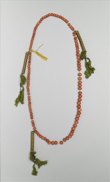 珊瑚數珠一串,計一百十五顆。珊瑚珠色澤橘紅,珠表面平滑光亮,以綿線穿繫之。上繫記捻三處,記捻以綠絲線纏繞成管狀,並有黃、紅線編成格紋裝飾之,下綴綠色絲穗。此數珠上繫黃籤一張,一面墨書:「嘉慶十八年十二月二十一日收曹進喜交」,一面「珊瑚數珠一串計珠一百十五箇」。數珠,佛教徒的祈禱用珠,一般以一○八珠為正軌,並分四段繫有佛頭、佛頭塔、記捻等,以方便記數。西藏進貢的數珠卻無定數,或可能是服飾的用物。