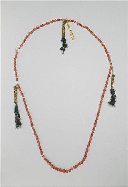 珊瑚數珠一串,二百零一顆,以黃絛帶穿繫之。記捻三處,以綠絲線纏繞成管狀,並有黃、紅、金線編成格紋裝飾之。。數珠,佛教徒的祈禱用珠,一般以一百零八顆為正軌,並分四段繫有佛頭、佛頭塔、記捻等,以方便記數。無定數的數珠,或可能是服飾的用物。