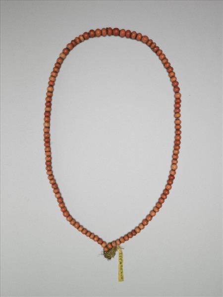 珊瑚珠一串,一百零九顆,珠色勻稱碩大,以金色絲線穿綴成,各珠之間並隔以絲線盤花之襯片。