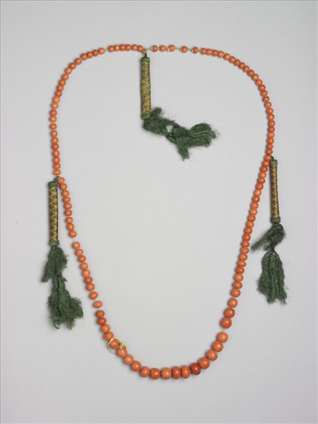 珊瑚朝珠一串,一百零九顆,以黃絛帶穿繫之。記捻三處,以綠絲線纏繞成管狀,並有黃、紅、金線編成格紋裝飾之。朝珠源自數珠,是清代君臣、后妃、命婦穿著朝服或吉服時,垂掛在胸前象徵身分地位的飾物。數珠,佛教徒的祈禱用珠,一般以一百零八顆為正軌,並分四段繫有佛頭、佛頭塔、記捻等,以方便記數。無定數的數珠,或可能是服飾的用物。