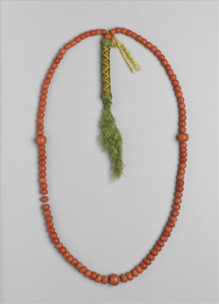 珊瑚數珠一串,一百零八顆,以黃絛帶穿繫之。記捻一處,以綠絲線纏繞成管狀,並有黃、紅、金線編成格紋裝飾之,分三段繫珊瑚佛頭。數珠,佛教徒的祈禱用珠,一般以一百零八顆為正軌,並分四段繫有佛頭、佛頭塔、記捻等,以方便記數。無定數的數珠,或可能是服飾的用物。