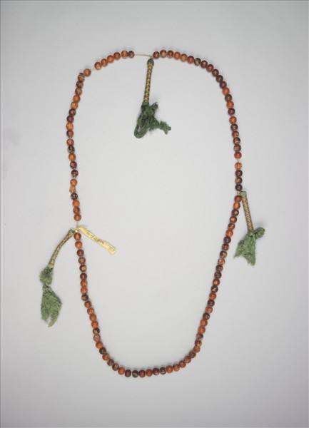 蜜蠟朝珠一串,一百零八顆,以黃絛帶穿繫之。記捻三處,以綠絲線纏繞成管狀,並有黃、紅、金線編成格紋裝飾之。數珠,佛教徒的祈禱用珠,一般以一百零八顆為正軌,並分四段繫有佛頭、佛頭塔、記捻等,以方便記數。