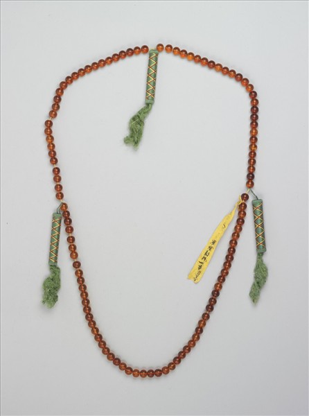 蜜蠟數珠一串,一百零八顆,以黃絛帶穿繫之。記捻三處,以綠絲線纏繞成管狀,並有黃、紅、金線編成格紋裝飾之。數珠,佛教徒的祈禱用珠,一般以一百零八顆為正軌,並分四段繫有佛頭、佛頭塔、記捻等,以方便記數。