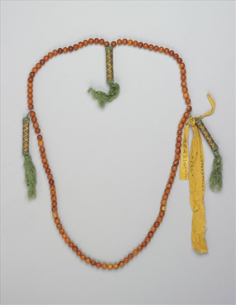蜜蠟數珠一串,一百零八顆,以黃絛帶穿繫之。記捻三處,以綠絲線纏繞成管狀,並有黃、紅、金線編成格紋裝飾之。數珠,佛教徒的祈禱用珠,一般以一百零八顆為正軌,並分四段繫有佛頭、佛頭塔、記捻等,以方便記數。
