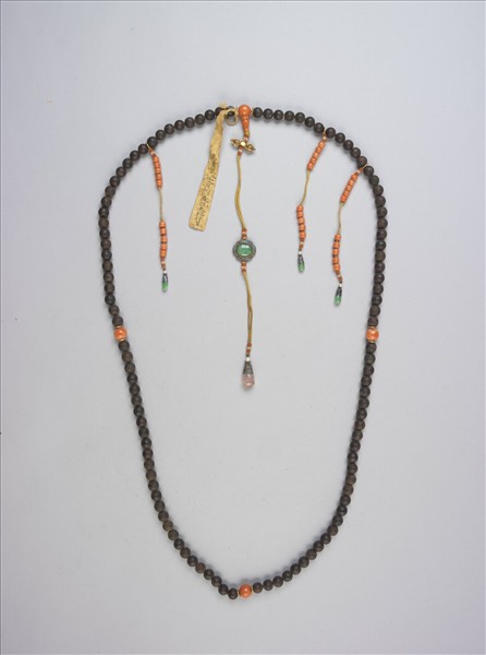 伽楠香小朝珠一串,以黃絛帶穿繫之。帶珊瑚佛頭及佛頭塔,間飾金色襯片。下黃絲絛背雲背雲穿繫珍珠珊瑚緝米珠間飾金剛杵,中間繫花形點翠座鑲嵌翡翠,上下飾珍珠珊瑚緝米珠,墜角為穿繫緝珍珠珊瑚米珠、小珍珠、點翠金托嵌碧璽。記捻三處,十顆珊瑚珠一串,上下穿繫珍珠珊瑚緝米珠,珍珠翡翠為墜角。