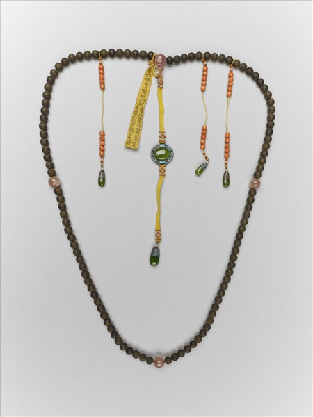 伽楠香小朝珠一串,以黃絛帶穿繫之。帶碧璽佛頭及佛頭塔。下黃絲絛背雲背雲上下穿繫珍珠珊瑚緝米珠,中間繫花形點翠座鑲嵌翡翠,上下飾珍珠珊瑚緝米珠,墜角為點翠托嵌翡翠。記捻三處,十顆珊瑚珠一串,上下穿繫珍珠珊瑚緝米珠,點翠托嵌翡翠為墜角。