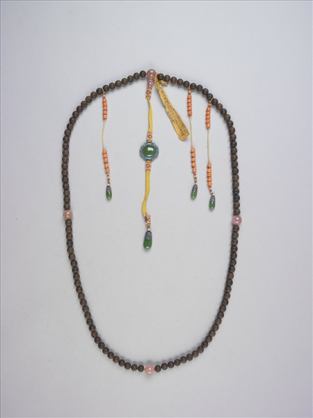 伽楠香小朝珠一串,以黃絛帶穿繫之。帶碧璽佛頭及佛頭塔。下黃絲絛背雲上下穿繫珍珠珊瑚緝米珠,中間繫花形點翠座鑲嵌翡翠,上下飾珍珠珊瑚緝米珠,墜角為點翠托嵌翡翠。記捻三處,十顆珊瑚珠一串,上下穿繫珍珠珊瑚緝米珠,點翠托嵌翡翠為墜角。