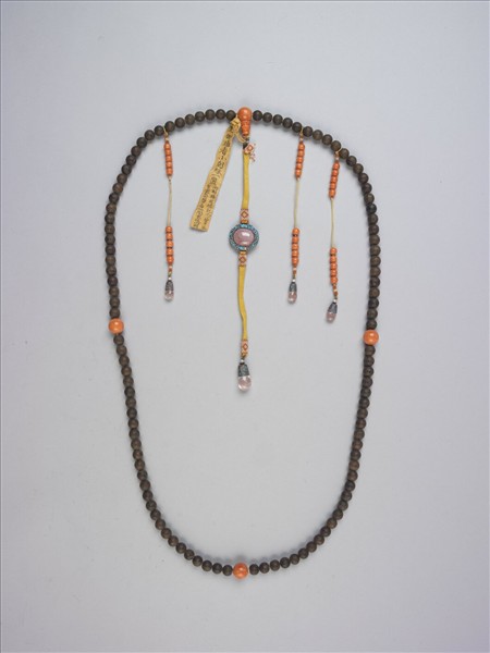 伽楠香小朝珠一串,以黃絛帶穿繫之。帶珊瑚佛頭及佛頭塔。下黃絲絛背雲上下穿繫珍珠珊瑚緝米珠,中間繫花形點翠座鑲嵌碧璽,上下飾珍珠珊瑚緝米珠,墜角為點翠托嵌碧璽。記捻三處,十顆珊瑚珠一串,上下穿繫珍珠珊瑚緝米珠,點翠托嵌碧璽為墜角。