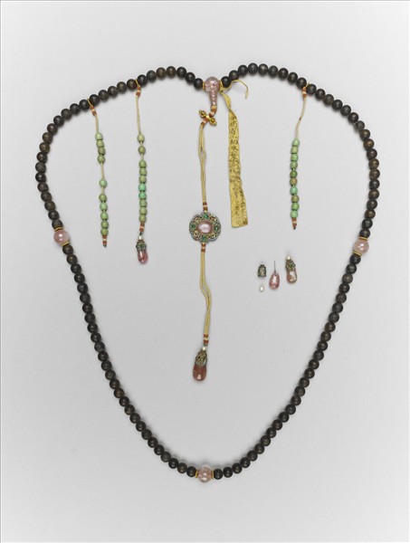 茄楠木朝珠一串,以黃絛帶穿繫之。帶碧璽佛頭及佛頭塔,間飾金襯片。下黃絲絛背雲穿繫珍珠珊瑚緝米珠,間飾金剛杵。中間繫花形點翠座鑲嵌翠綠玉珠和一塊碧璽,上下飾珍珠珊瑚緝米珠,墜角為珍珠頂點翠金托,嵌翡翠。記捻三處,十顆松石珠一串,上下穿繫珍珠珊瑚緝米珠,珍珠頂點翠托,嵌碧璽為墜角。