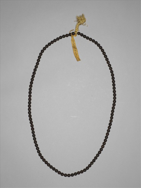 清宮茄楠沉香來源有藩屬國進貢、官員進貢與採買。據黃籤顯示,此串念珠身由和珅所進,屬於半成品,尚未配佛頭、隔珠、記捻等。數珠、念珠原為善男信女及僧尼念佛計算誦讀次數的工具,不計佛頭多為一百零八顆,但也有或多或少,不限此數者;後來因講究質材、色澤或雕工,而演變成一般人把玩、珍藏的飾物。