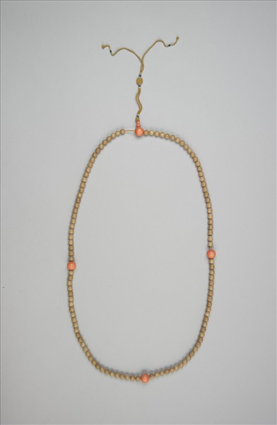 黃茜牙念珠一串,以黃絛帶穿繫之,帶珊瑚佛頭及佛頭塔,黃絲絛背雲下穿繫一結,並有藍白絲線纏繞為飾。此念珠為染色之象牙磨製而成。念珠,佛教徒的祈禱用珠,一般以一百零八顆為正軌。