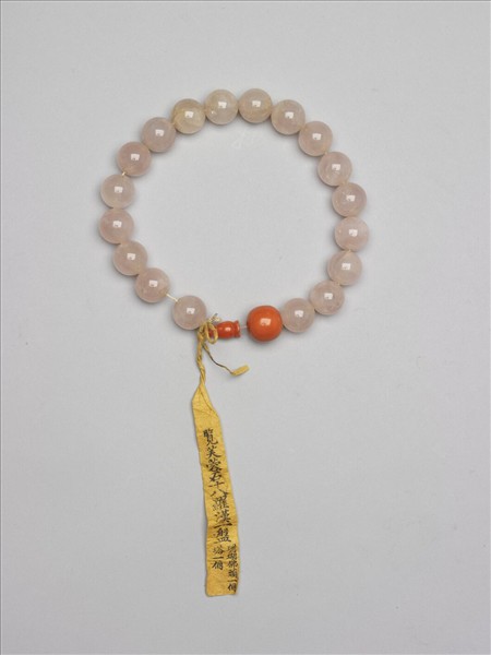 手串,由十八顆芙蓉石珠子、珊瑚佛頭、佛頭塔組成。十八子又稱手串,原本應是握在手中念經記數的工具,十八世紀中期以來,已成為祈福裝飾之用,也是互相贈送的禮物。佩帶時,穿對襟衣是掛在第二顆鈕扣上,穿大襟衣時,則掛在腋上方的襟鈕上。