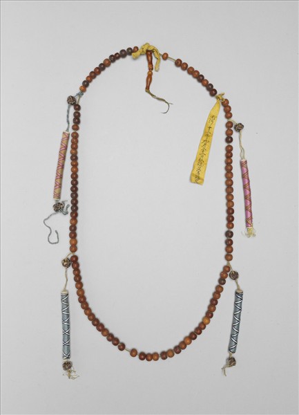 蜜蠟數珠一串,一百三顆,以黃絛帶穿繫之,帶蜜蠟佛頭塔。記捻四處,上下飾紐結;兩處以藍絲線纏繞成管狀,並有藍、白線編成格紋裝飾之,另兩處以粉紅絲線纏繞成管狀,並有深淺粉紅線編成格紋裝飾之。數珠,佛教徒的祈禱用珠,一般以一百零八顆為正軌,並分四段繫有佛頭、佛頭塔、記捻等,以方便記數。