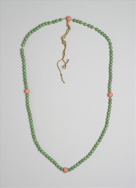 綠茜牙念珠一串,以黃絛帶穿繫之,帶珊瑚佛頭及佛頭塔,塔下穿繫一結,並有藍白絲線纏繞為飾。此念珠為染色之象牙磨製而成。念珠,佛教徒的祈禱用珠,一般以一百零八顆為正軌。