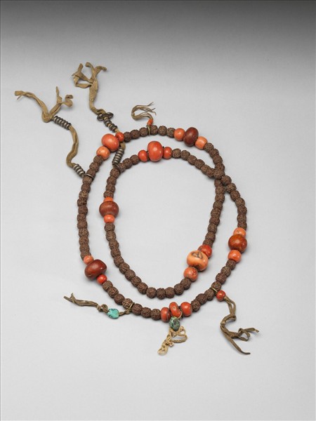 脫落金剛子數珠,帶珊瑚佛頭、蜜蠟佛頭、珊瑚珠、松石珠、蜜蠟珠、銀珠記捻、銀杵一個等。