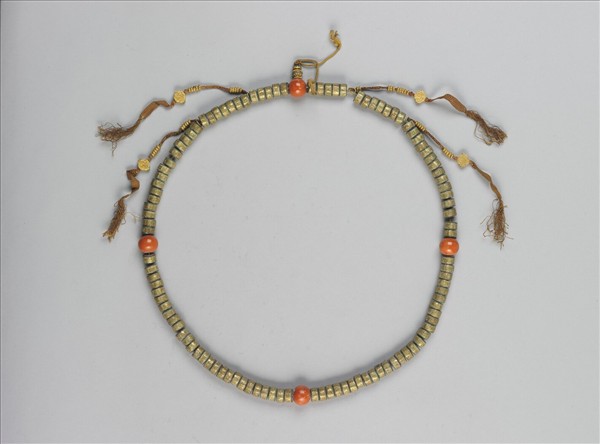 西藏作品,十八世紀。一○八顆珠,為象牙仿嘎布拉數珠外形,製作華麗。每顆上下嵌以銅片,珠面各嵌金絲梵字七真言;以黃絛帶穿繫。帶珊瑚佛頭、金嵌松石佛頭塔;記捻四串,各繫金算盤珠及金嵌松石飾件為墜腳,墜腳上各呈梵字。