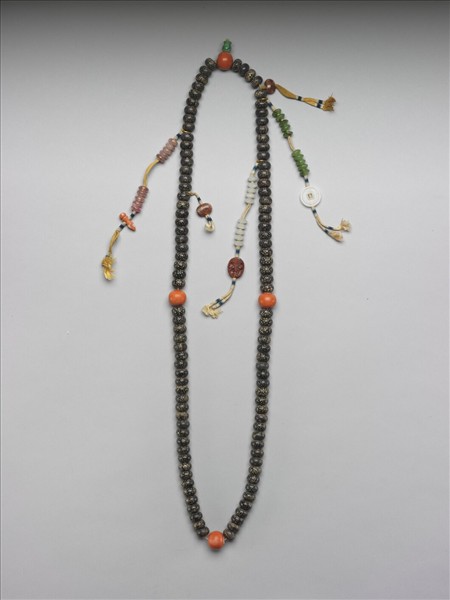 漆念珠一串,帶松石佛頭塔和珊瑚佛頭珠。記捻五處,兩處繫掛瑪瑙珠一顆,其餘三處各穿繫碧璽珠、綠玉珠、硨渠珠十顆一串,墜角各飾珊瑚杵、硨渠古錢、瑪瑙佩飾及纏繞藍白絲線。