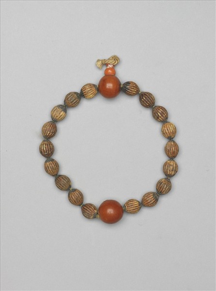 手串,計有羅漢子十八粒,每九粒間一蜜蠟佛頭,其一貫蜜蠟佛頭塔。羅漢子呈淺褐色,表面帶有直楞紋。