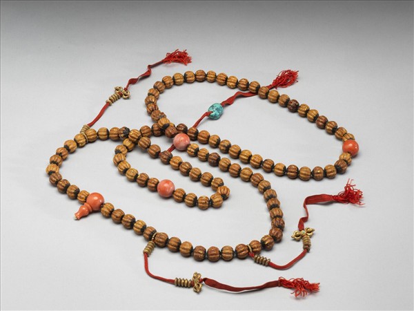 漆念珠,計一百零八粒,珠上繪有橘、綠雙色同心圓紋;珊瑚佛頭塔四與佛頭塔一相串於頂部,旁掛記捻三串與綠松石流蘇一串,記捻皆貫十粒金扁珠與金剛杵一。