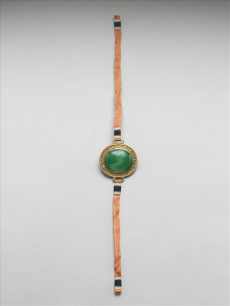 橢圓形背雲,金屬雲紋外環嵌不透明綠玻璃,圓弧形表面呈現綠白迴旋紋理,近於翡翠色澤。上下穿繫於紅色縧帶。留有咸豐二年(1852)黃籤。