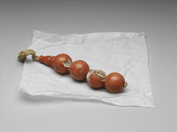 珊瑚佛頭四與珊瑚佛頭塔一為一串,佛頭殘破。