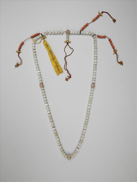 水石念珠,計一百零八粒,色澤灰白,每隔二十七粒間一粉紅碧璽佛頭,其一貫白玉佛頭塔與金剛杵;記捻三串,貫珊瑚珠十與金剛杵一。