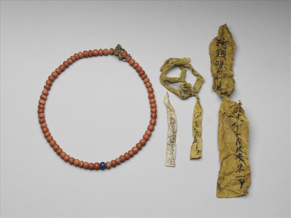 珊瑚念珠一串,計六十八粒,色亮橘,加間藍色珠一粒。