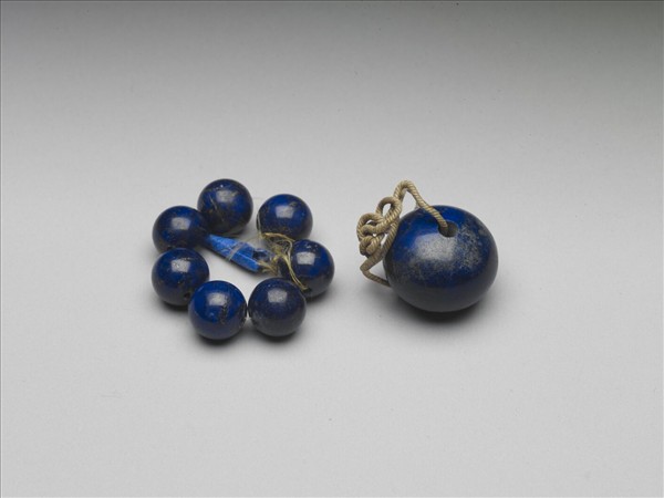 青金石珠八粒,共有七小粒及一大粒,色湛藍雜灰斑塊。