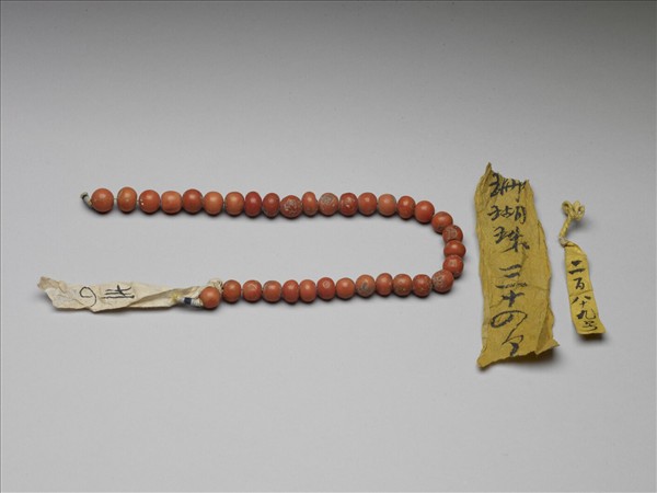 珊瑚珠計三十四粒,色橘,珠身帶有凹陷。
