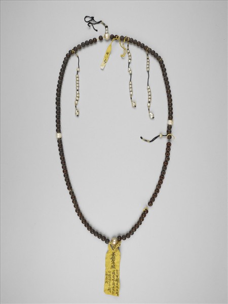 菩提念珠一串計一百零八粒,每隔二十七粒間一珍珠佛頭,其一貫珍珠佛頭塔;記捻三串,各串十粒珍珠與飯塊珠墜角。